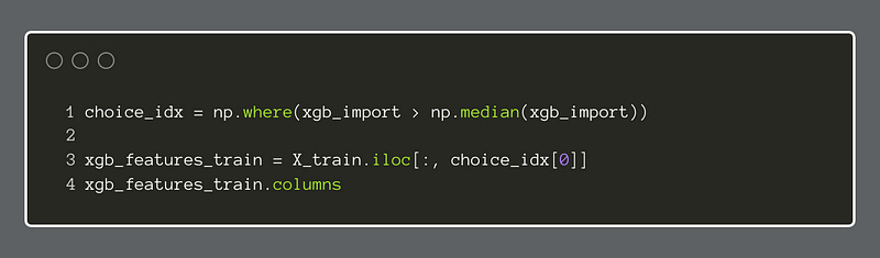 Instead of just picking the top features by sight, we can use a formula of some kind to pick them for us. In this example, we chose to select all features that were greater than the median of all feature importances.