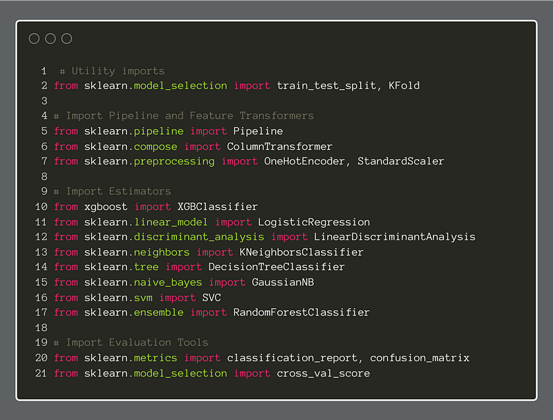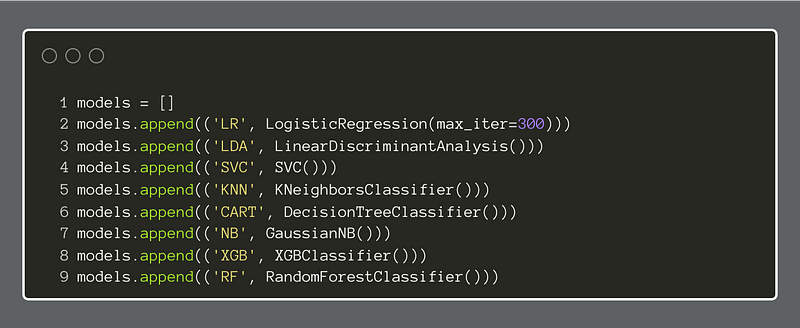 The first step is to create a Python list, and then append each of our candidate classifiers to it.