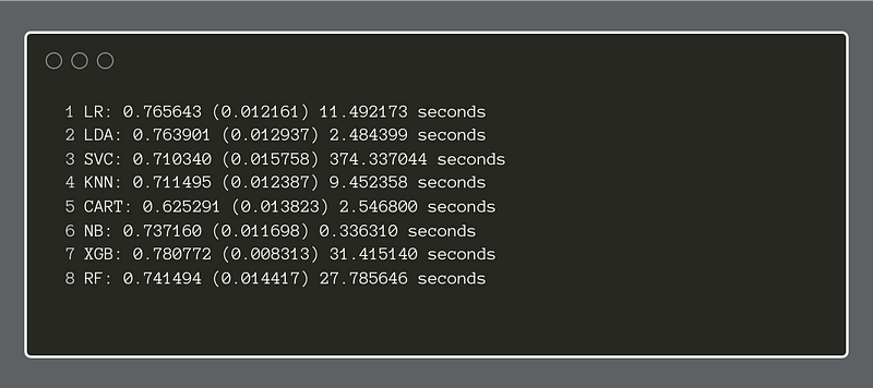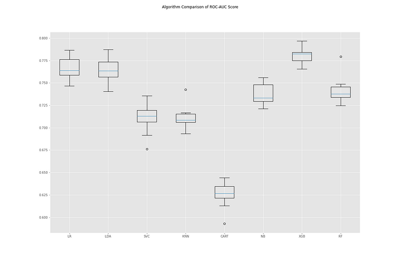 Compared side-by-side, we can see that the XGBoost classifier performed better than the others. Sharing second place, Logistic Regression and Linear Discriminant Analysis show promise. With this information, we can go on to focus on one or two of these classifiers and tune their respective hyperparameters. By using this method upfront, we save time and energy by focusing on developing models that show genuine potential for performing the task at hand.