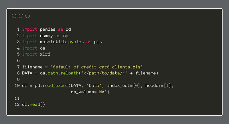 The first step is to import some initial packages and import the data from Excel. Below, we have imported the data into Pandas with a helper application, xlrd. This will allow us to import .xls files, and even select the specific sheet in the workbook. This produces a dataframe with 24 columns with 30,000 instances. For a more detailed look at this dataset, see this article .