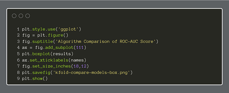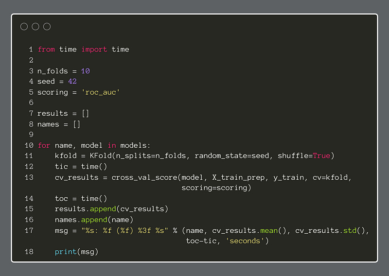 Next, we set parameter values, like n_folds and scoring for the KFold cross-validator. Here, the choice of roc_auc as a scoring metric is important. Our task is supervised binary classification, which means we have access to the target variable, and it is a binary choice, 0 or 1.